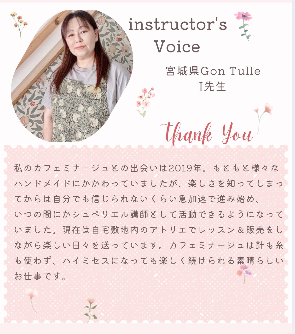 カフェミナージュ®を中心としたハンドメイド雑貨のフリーレッスン及び認定講座を自店舗にて随時開催しております。 商品の販売(オーダー含む)は店舗以外でもイベント等で行っております。イベントはinstagram でのご案内をご覧ください。 supervisor(SV)講師 5アイテム以外の受講可能アイテム シンプルトレイ スマホクリップ ミニコロコロ 筒形ティッシュケース ミニ小物ケースperfume 二段ディスプレイスタンド 携帯用クリーナー モップ・衣類用クリーナー 除菌ボトル スイングダストボックス ジュエリーケース マカロンタワー ボックス大小 ダイヤモンドパーティバッグ マスクストッカー下取出し お財布のベッド(蓋あり・なし) テープカッター 鉛筆削り ティーバッグホルダー エタージェラ FUKUSA カレンダーフレーム いっしー インスタグラム whisper
